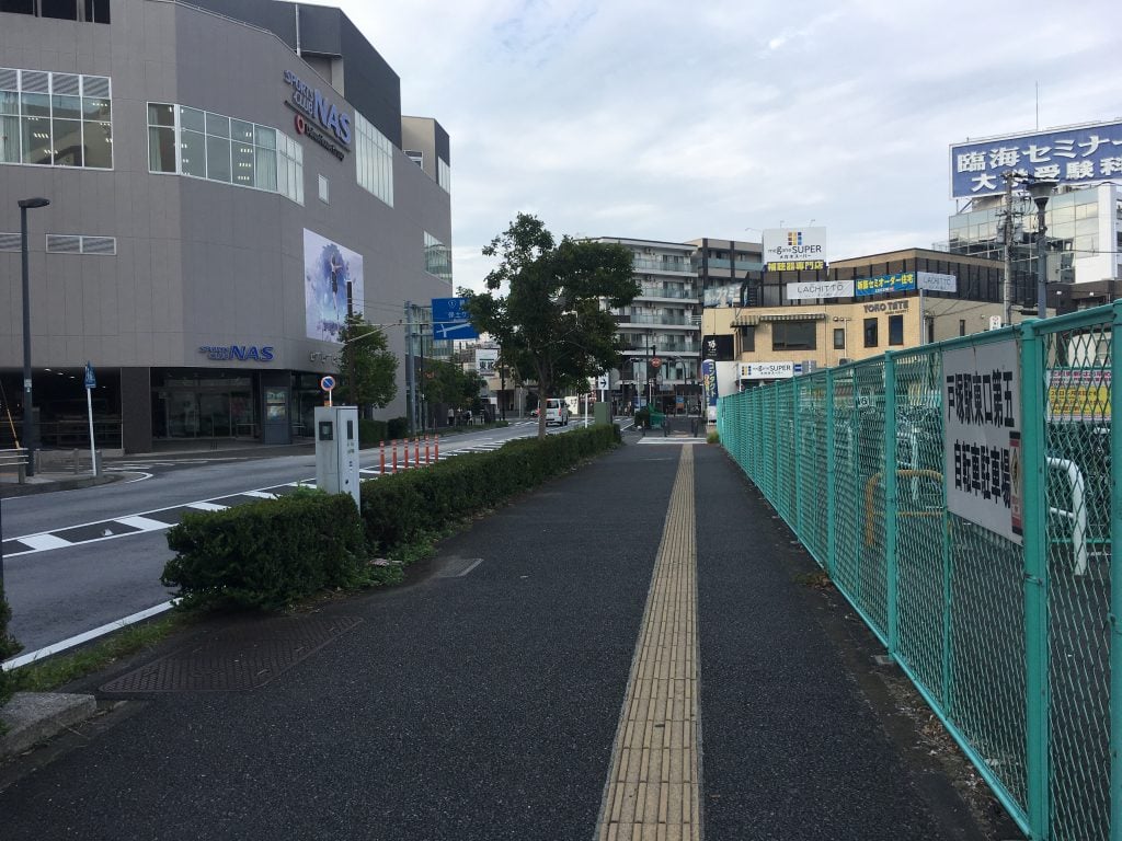 左に曲がり、駐輪場を右手に見ながら横切って目の前の横断歩道を渡ります。