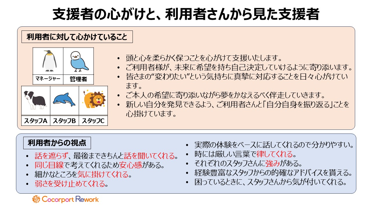 スタッフにインタビューして、支援に対する心がけと、利用者からみた評価を対比させるという企画でした。
