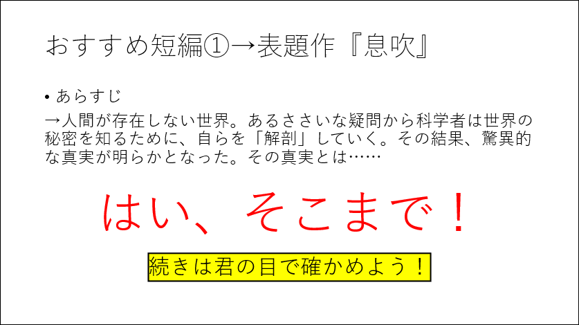 私が紹介した本はSF短編集のテッド・チャン作『息吹』です。