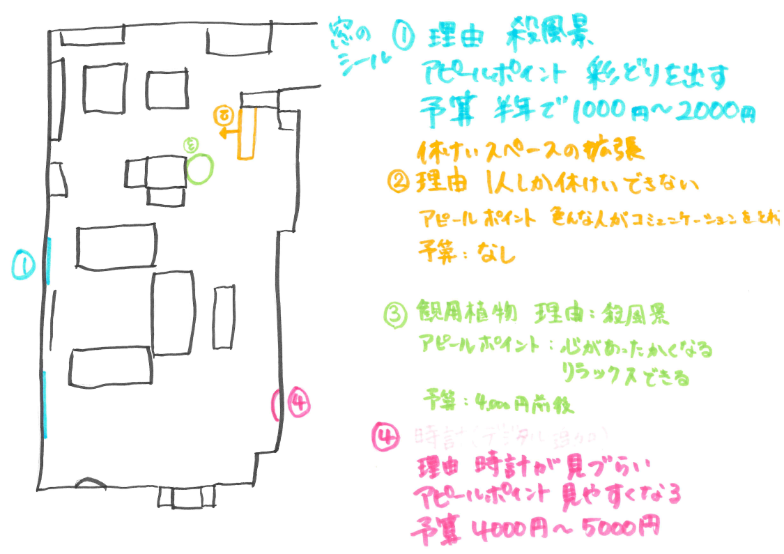 スタッフが考えていたアイデアと被るものもありましたが、「これは思いつかなかった!」「こんな要望があるんだ」など、スタッフが思いつかなかった”トレイニーさん目線”で考えた模様替えプランがまとまりました。コミュニケーションのスキルアップにもつながり、大変有意義なプログラムになりました!