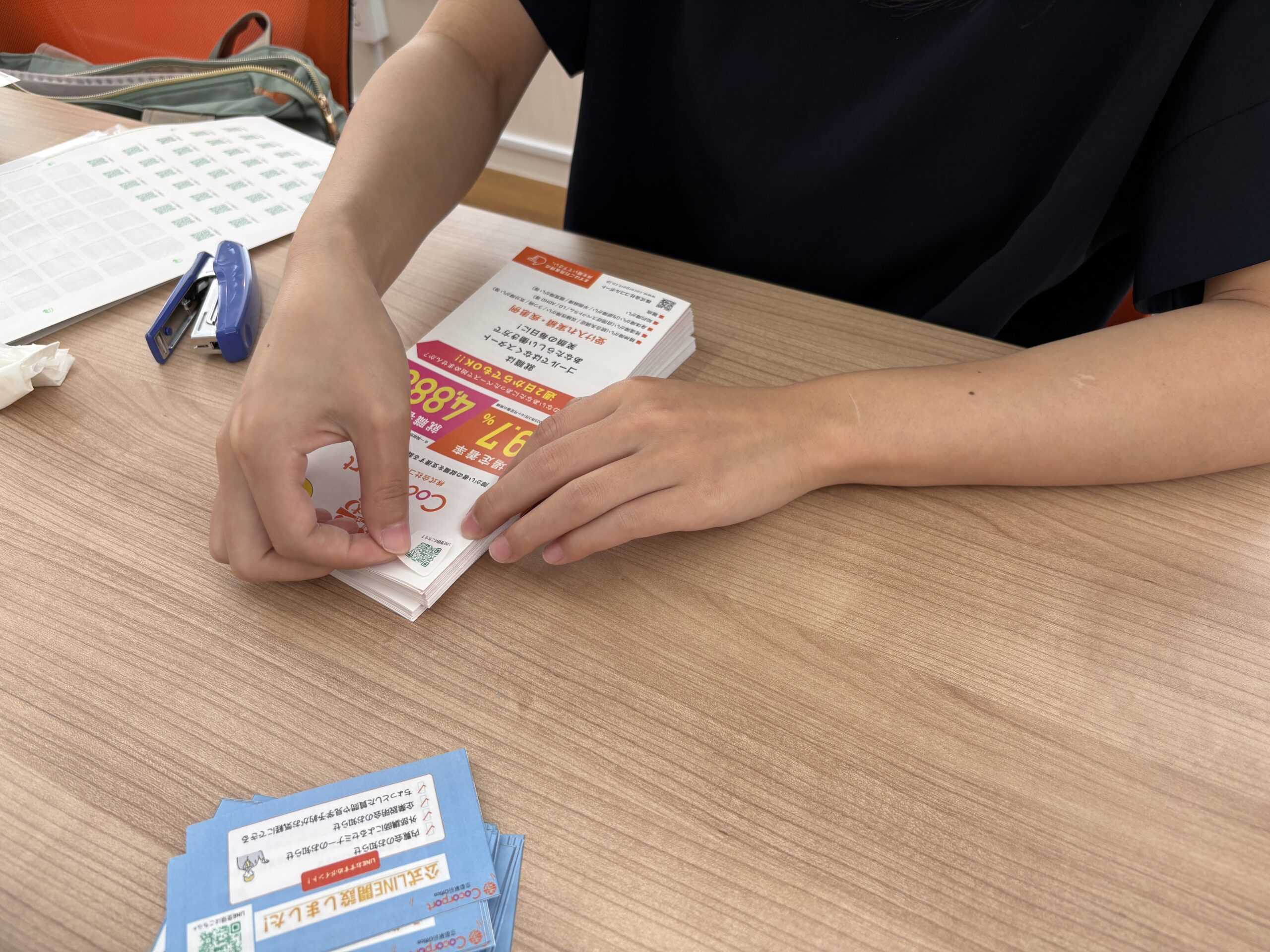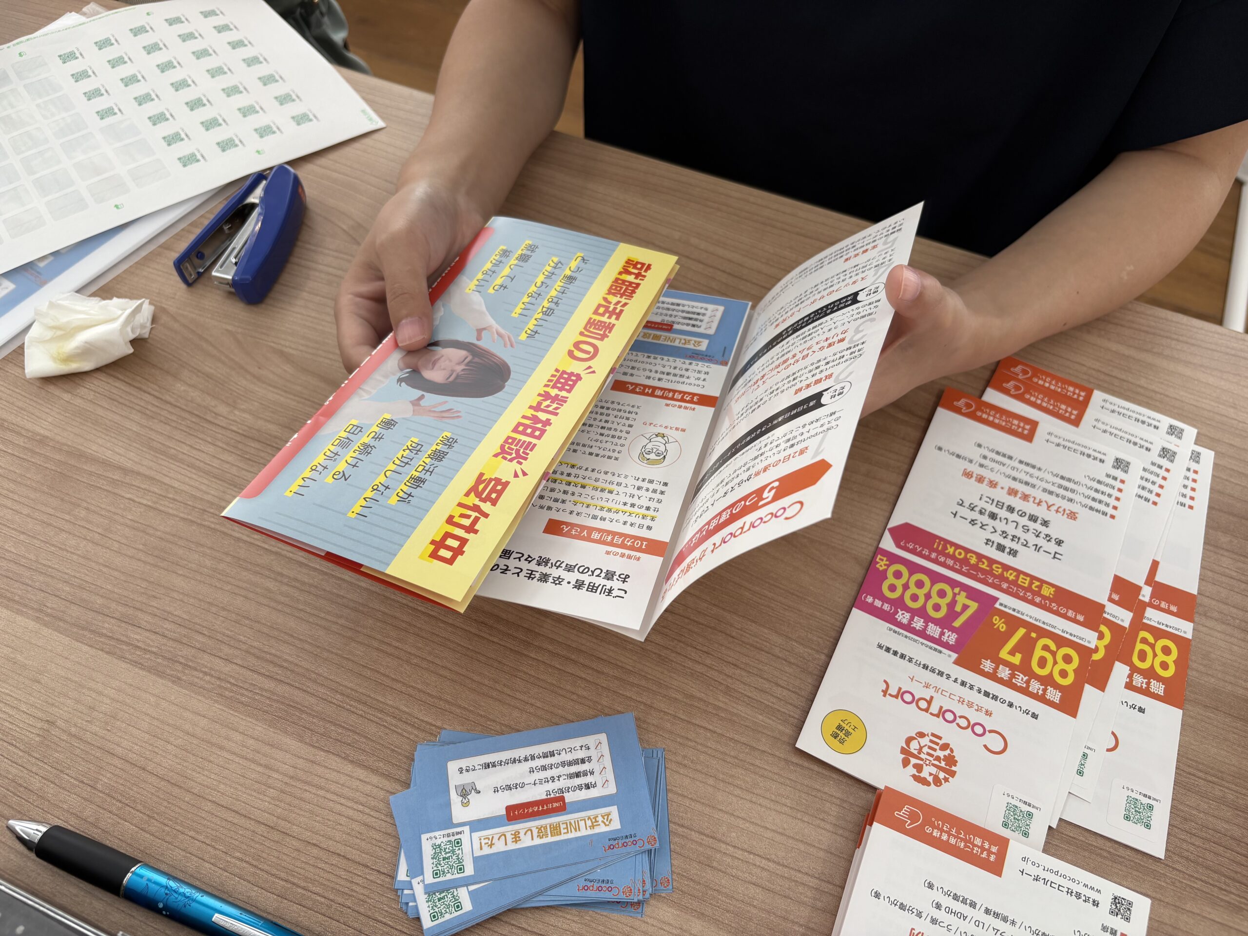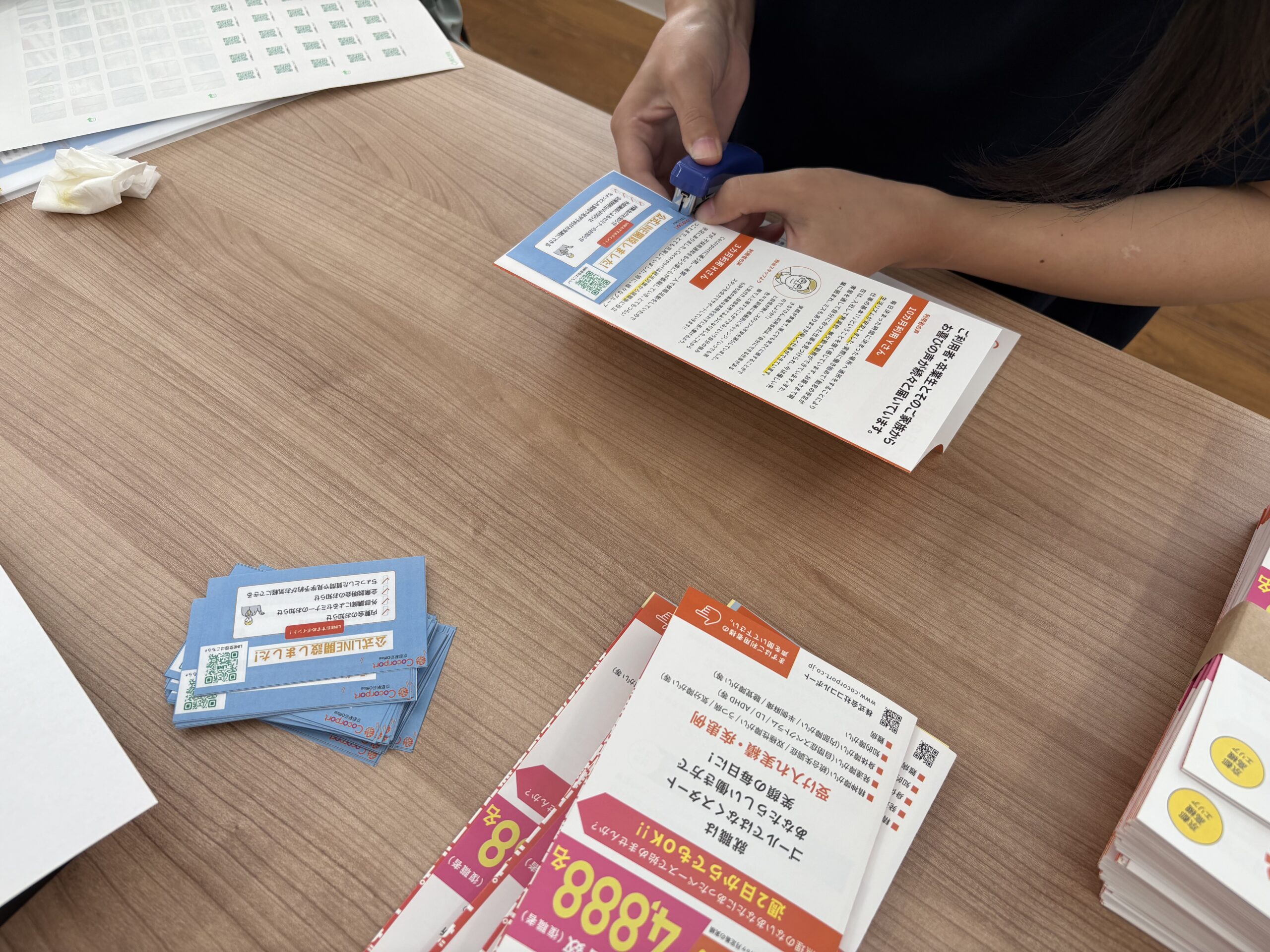 - パンフレットの端にLINEのQRコードのシールを貼る。