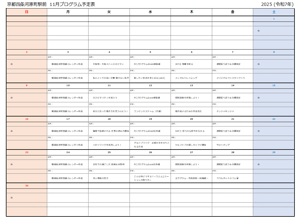 【11/3(月)】模擬就労特別編カレンダー作成