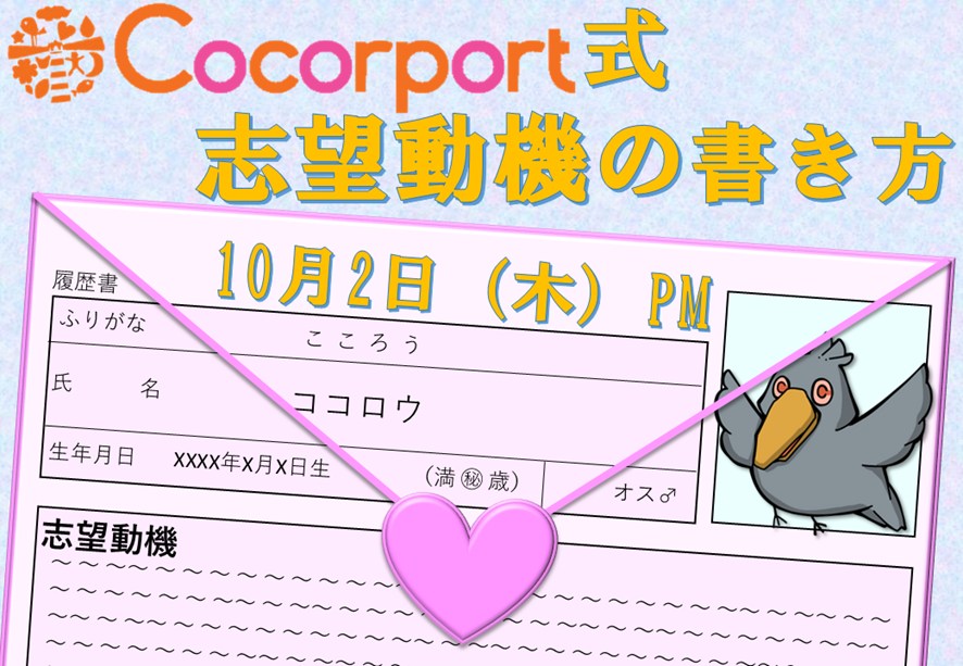 プログラム「ココルポート式志望動機の書き方」は10/2(木)13:00~15:00開催予定です。