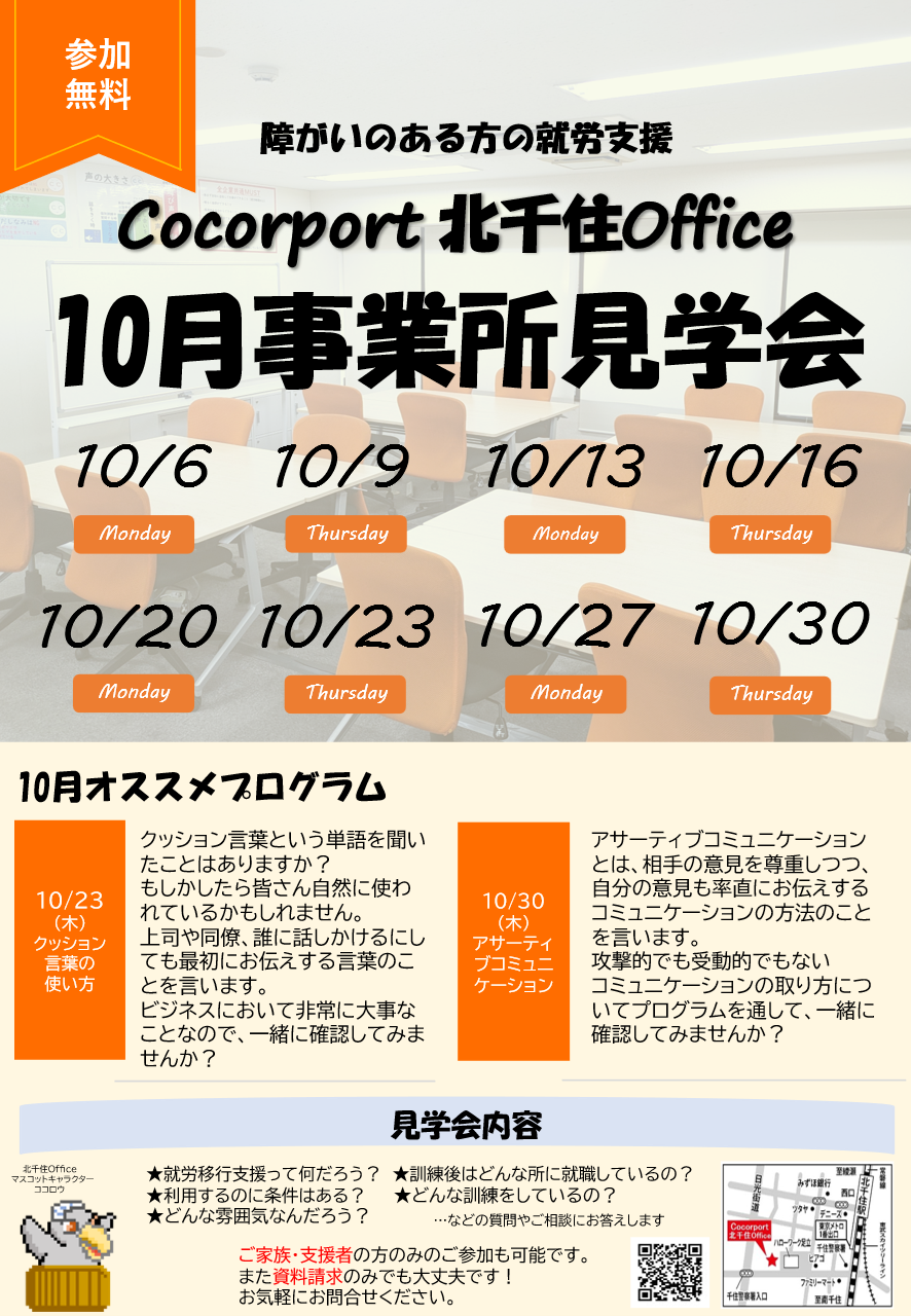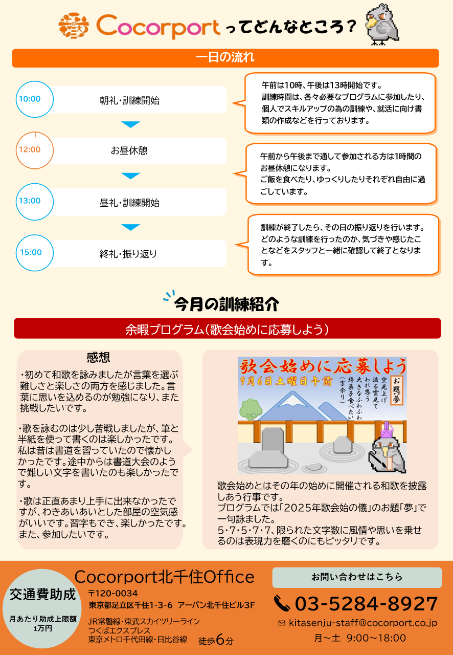 毎月開催している事業所説明日程とおすすめプログラムを記載したチラシになります。ココルポートでの1日の流れや訓練内容の紹介、見学会の内容等をまとめてあります。