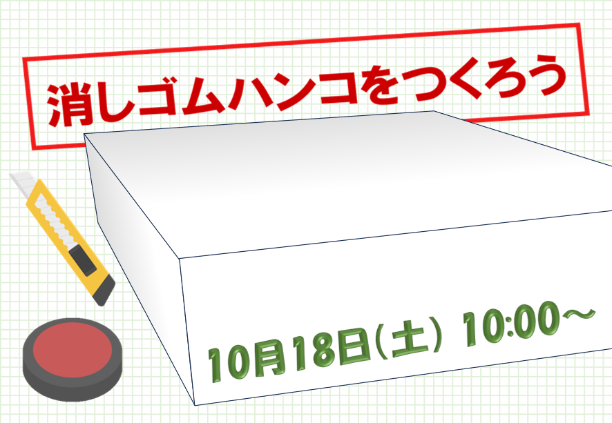 プログラム「消しゴムハンコをつくろう」は10/18(土)10:00~12:00開催予定です。