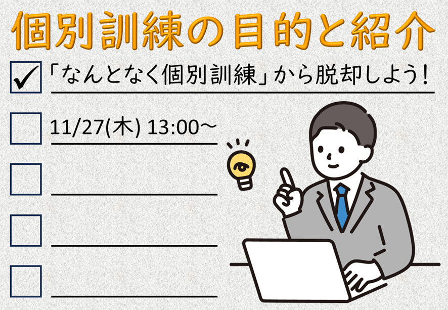 プログラム「個別訓練の目的と紹介「なんとなく個別訓練」から脱却しよう!」は11/27(木)13:00~15:00開催予定です。