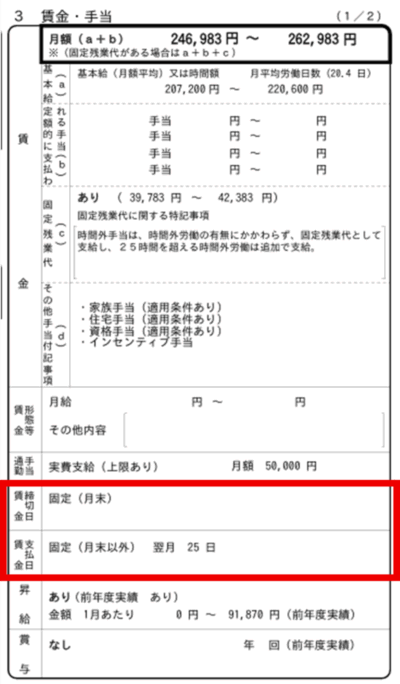 求人票の「3賃金・手当」の欄に賃金締切日と賃金支払日が記載されています。