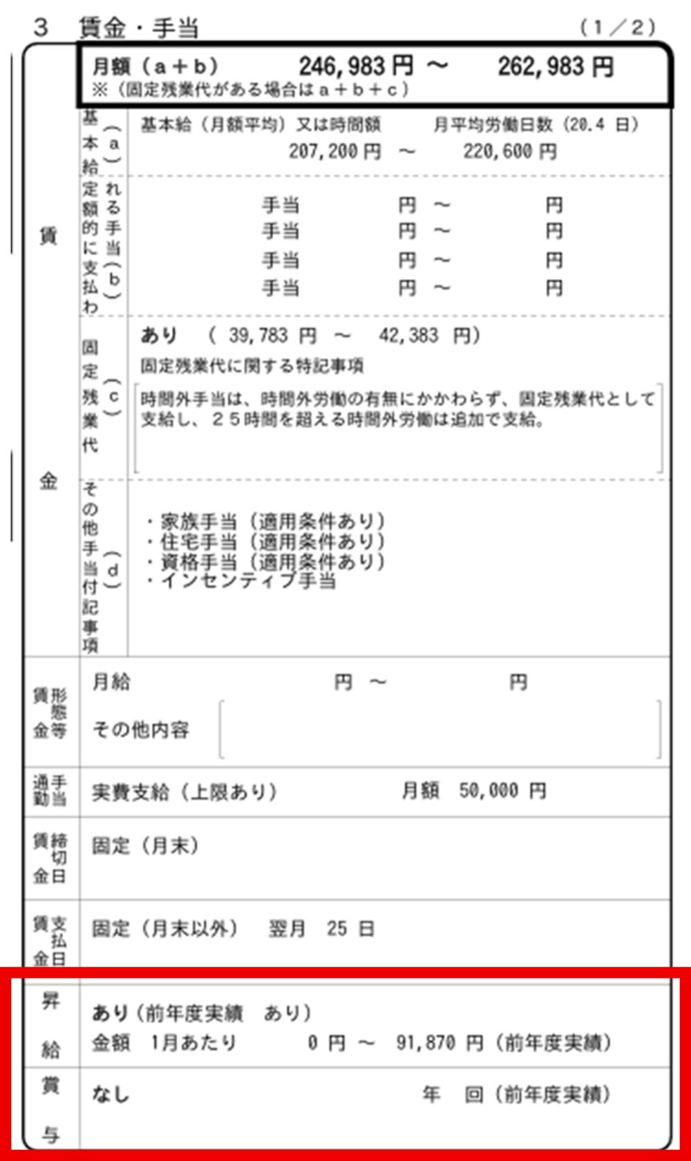 求人票の「3賃金・手当」の欄の下の方に昇給と賞与が記載されています。