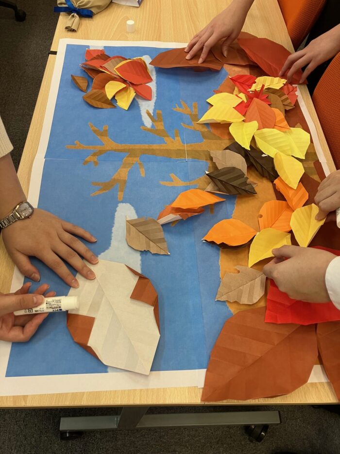 作った落ち葉を、A2サイズの用紙に皆で相談しながら貼り付けていきます。