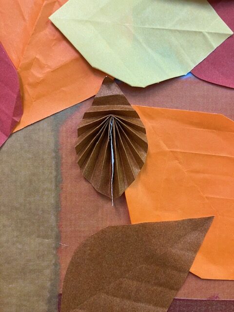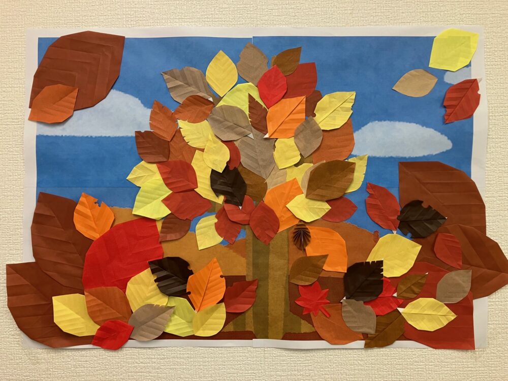 今回は、余暇活動で秋の飾りということで、落ち葉をモチーフにした集合作品を作成していただきました。