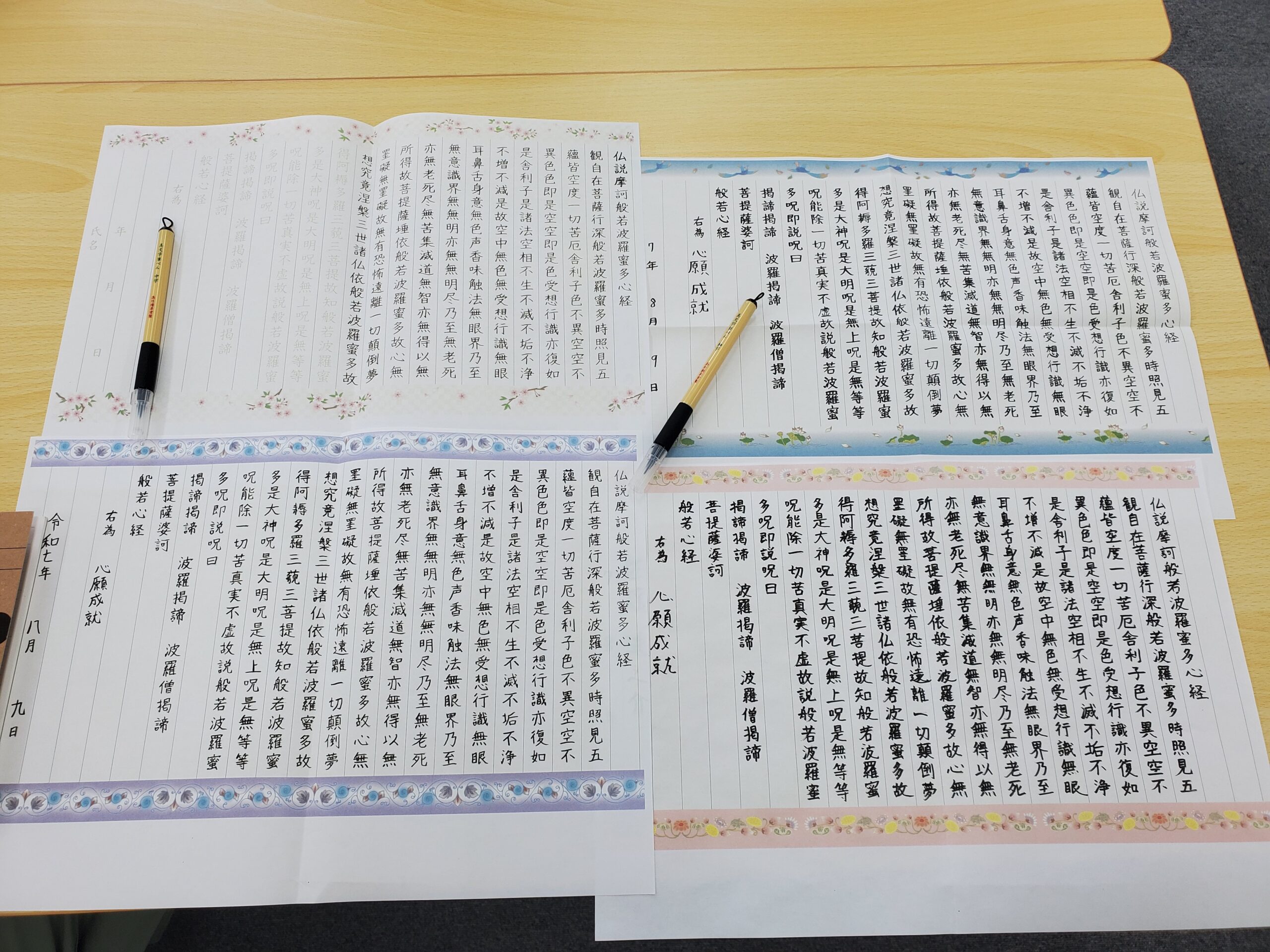初めての写経。これ1枚に2時間近くかけて書きます。文字と向き合うことで心が落ち着いてくるきがします。